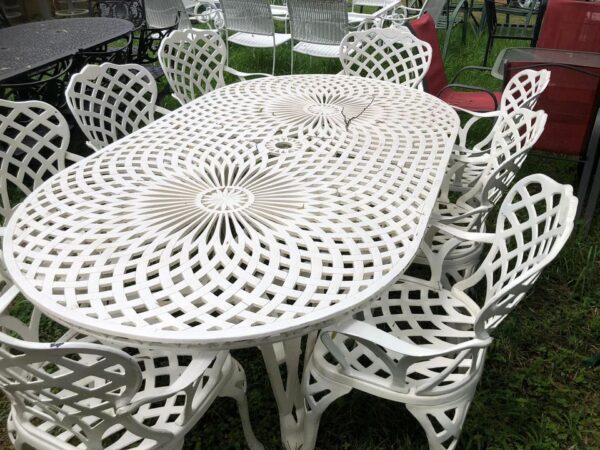 Beautiful plaisir du jardin 8 seater cast iron patio set. Weatherproof quality furniture great for outdoor use . Can never rust and will last more than a lifetime.