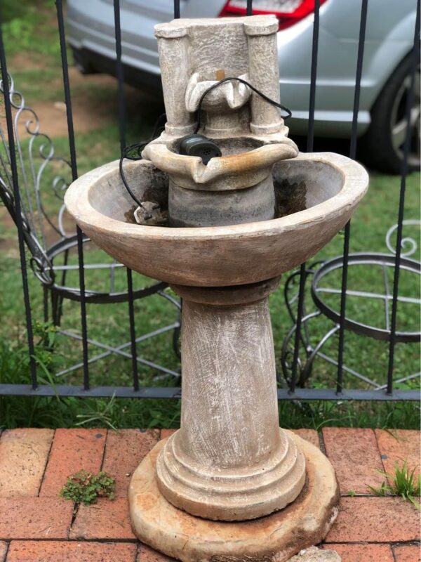 Stone water feature with pump. Good condition and pump in working order. Approximately 90 cm high and basin 40cm wide