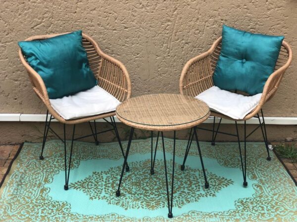 Beautiful modern polywicker bistro set with metal pin legs. Nice comfy set for any corner of your home. Both in and outdoors Good as new.
