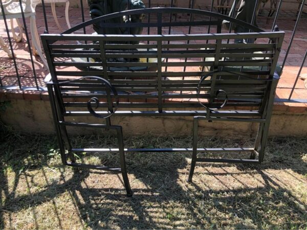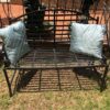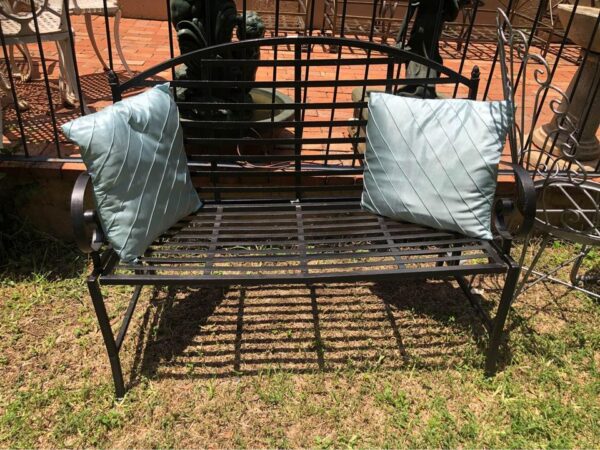 Solid wrought iron chairs with cushions. For garden or patio area. Wrought iron table frame (missing glass top) Also available for small fee Table can be tiled or glass top replaced. L210cm x W90cm x H75cm Price per chair