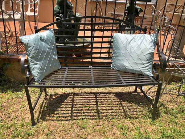 Solid wrought iron table with thick glass top and 6 chairs with custom made cushions