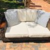 Beautifully forged set of 2 heavy wrought iron lounge chairs with cushions and side table