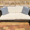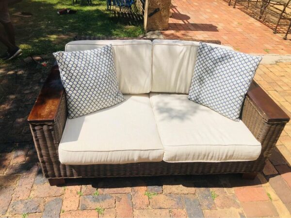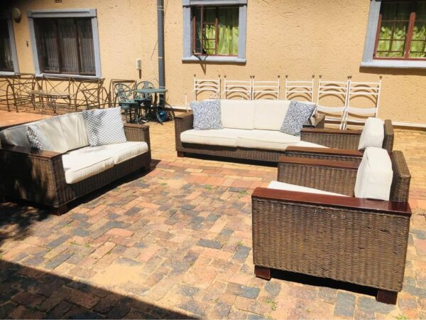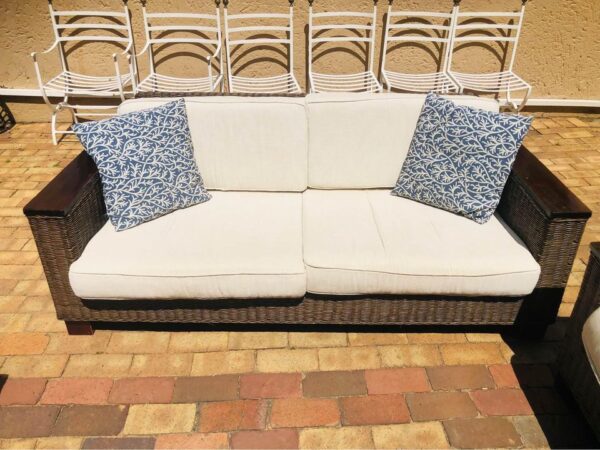Solid wrought iron chairs with cushions. For garden or patio area. Wrought iron table frame (missing glass top) Also available for small fee Table can be tiled or glass top replaced. L210cm x W90cm x H75cm Price per chair