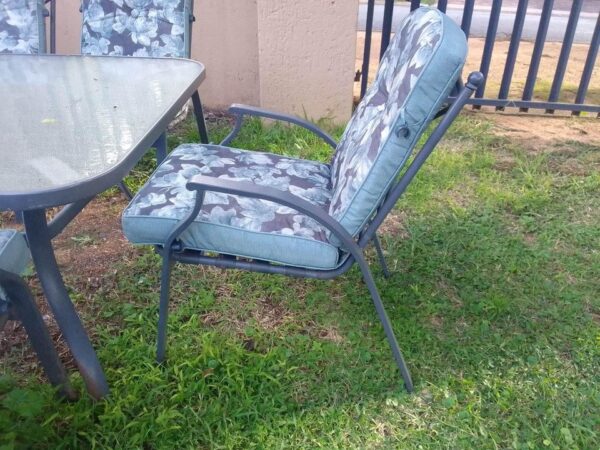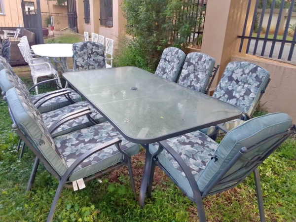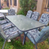 Aluminium table with tempered glass top and 8 armchairs with good quality cushions