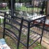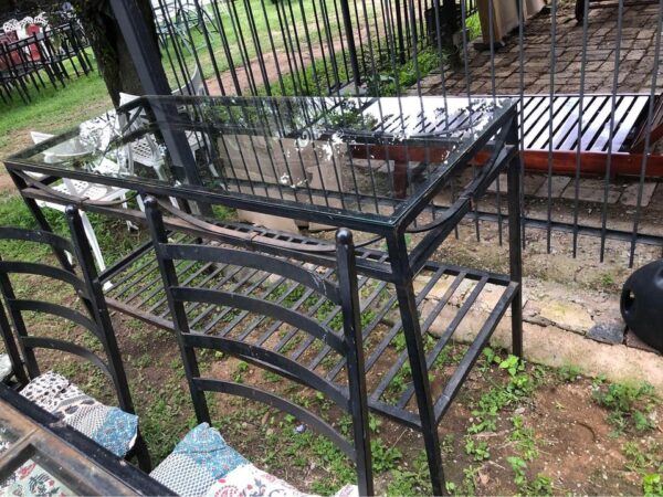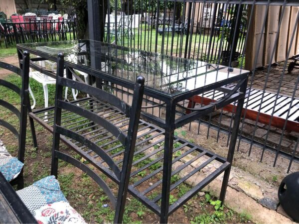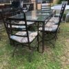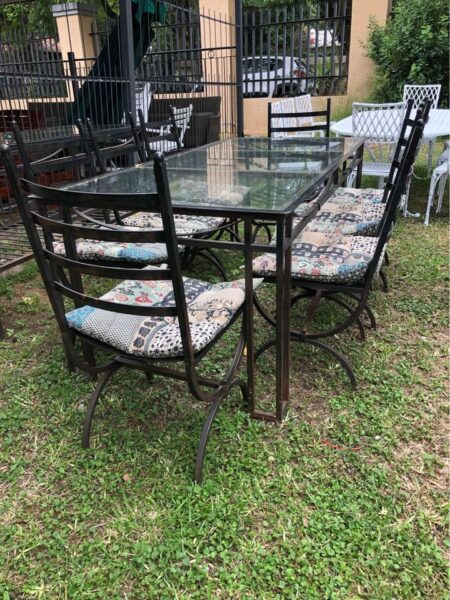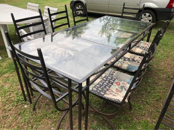 Solid wrought iron chairs with cushions. For garden or patio area. Wrought iron table frame (missing glass top) Also available for small fee Table can be tiled or glass top replaced. L210cm x W90cm x H75cm Price per chair