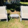 Solid wrought iron chairs with cushions. For garden or patio area. Wrought iron table frame (missing glass top) Also available for small fee Table can be tiled or glass top replaced. L210cm x W90cm x H75cm Price per chair