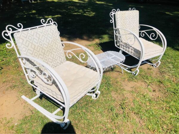 Beautifully forged chairs with wicker seats treated for outdoor use.