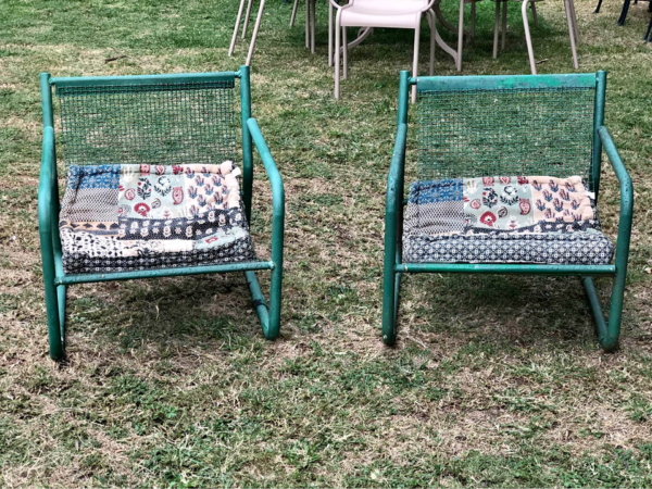 Beautifully forged chairs with wicker seats treated for outdoor use.
